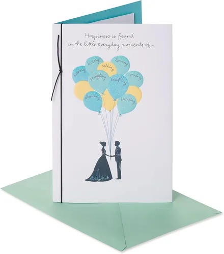 Haz que el día de la pareja recién casada brille con esta tarjeta de boda contemporánea adornada con papel de aluminio. Cuenta con una silueta de moda de novia y novio sosteniendo un ramo de globos brillantes impresos con palabras románticas. Cartulina texturizada de calidad con características en relieve y un cordón decorativo que añaden un toque premium. La obra de arte del globo continúa dentro de la tarjeta en un inserto de papel más pequeño, bordeado por un puño de aluminio prismático azul. Junto con una cálida copia de felicitación para los novios, es la tarjeta perfecta para compartir deseos de boda sinceros en su día especial. American Greetings ofrece tarjetas de felicitación excepcionales, papel de regalo y productos de celebración para que puedas conectarte de maneras que se adapten a tu personalidad y estilo auténtico.