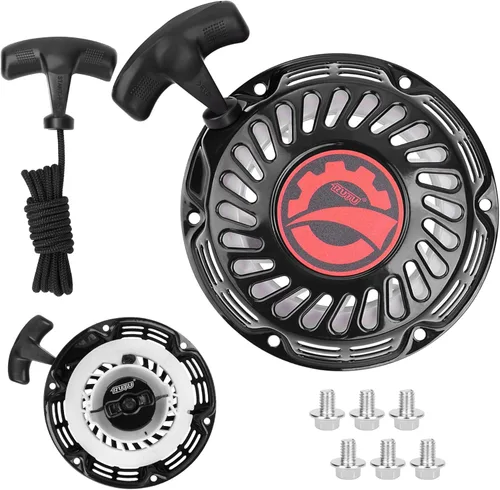 Reemplazo del arrancador: se adapta a 5.5hp 6.5hp 7hp motor Predator 212cc Coleman BT200X CT200U 200cc Mini Bike, compatible con Honda GX160 GX200 y muchos clones Honda. Cómodo diseño ergonómico: el mango de goma grande y suave es más cómodo y más fácil de agarrar. Carcasa de metal más gruesa, placa de trinquete y trinquete que garantizan una larga vida útil. El cordón de nailon negro de 4.9 pies (4.9 ft) proporciona arranques suaves y sin restricciones cada vez. Amplia compatibilidad: pieza de repuesto para una variedad de equipos de jardín motorizados como timones, bordeadoras, bombas de agua, sopladores de nieve, lavadoras a presión, generadores y vehículos pequeños, como go karts, mini bicicletas, etc. El juego incluye: 1 conjunto de arranque con cable de tracción adjunto, 1 cable de repuesto de 4.9 pies con asa, 6 tuercas de montaje. Instalar y utilizar correctamente para una vida útil máxima. Atención: siempre tira ligeramente del agarre del arrancador y desenrollar un poco de cable hasta que sientas resistencia, luego tira rápidamente para arrancar el motor.