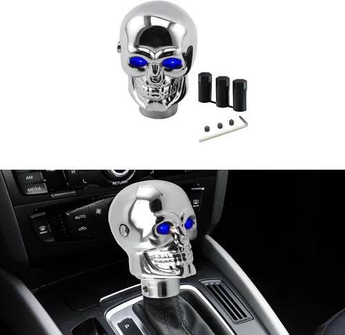 Excelente material: La perilla de cambios con calavera está hecha de aleación de aluminio de alta calidad. Su superficie es pulida, lisa y tiene un tacto excelente. No se decolorará, resistente al desgaste y a la oxidación, no se daña fácilmente, con una larga vida útil y adecuado para uso a largo plazo Luces LED ajustables: Las luces decorativas LED en los ojos de la cabeza de engranaje de calavera son ajustables, los botones laterales pueden ajustar las luces para que parpadeen, parpadeen lentamente y permanezcan encendidas constantemente. Múltiples efectos de iluminación lo hacen más genial e interesante Aplicable en una amplia variedad: pomo de palanca de cambios de resina con cabeza de engranaje de calavera de tamaño 2.7*1.7 pulgadas, equipado con un juego de tornillos y una llave hexagonal, y tres adaptadores de goma (8 mm, 10 mm, 12 mm/0.32, 0.39, 0.47 pulgadas), que pueden satisfacer perfectamente las necesidades de diferentes vehículos Decoración de Calavera: Pomo de palanca de cambios universal con forma de cabeza de calavera, los ojos pueden emitir diferentes colores de luz, rojo y azul. Muestra tu gusto personal, mejora el interior de tu vehículo, haz que tu coche sea más especial y genial. Es el mejor regalo para amigos, familiares y compañeros de clase Fácil de instalar: la perilla de la palanca de cambios se puede instalar fácilmente en pocos minutos. 1. Retira la cabeza original de la perilla de cambio. 2. Seleccione una funda de goma adecuada. 3. Gírelo para instalarlo en la palanca de cambios. 4. Apriete todos los componentes con una llave Allen