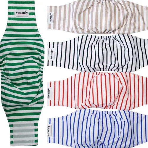 Cuando tu perro está orinando, ¿quieres que tu hogar esté más limpio y que el perro se sienta cómodo? Elige nuestro pañal para perros es tu elección correcta. vecomfy es una marca profesional de pañales para perros. Características: Almohadilla de orina súper fácil de absorber La almohadilla de microfibra de 2 capas está cosida en la banda para el vientre del perro, absorbe la orina, lo mejor para perros machos con incontinencia urinaria, micción y problemas de marcado, perros ancianos, etc. Impermeable y a prueba de fugas, hace que el hogar sea más limpio. En la parte superior de la capa exterior del pañal tiene material 100% impermeable y a prueba de fugas, evita daños en el sofá y la alfombra, hace que tu hogar esté más limpio y seco. Cierres grandes, duraderos y fáciles de ajustar. Los cierres cuadrados grandes con doble costura, son duraderos y duran mucho tiempo, son fáciles de poner y quitar, circunferencia ajustable de la cintura del perro, y no se pegan al pelo de tus mascotas. Mantén a tu perro disfrutar de usarlo y permanezca en su lugar bien cuando tu perro camine y corra. Bordes elásticos cómodos Los 2 bordes elásticos de la envoltura para perro proporcionarán comodidad adicional para la cintura del perro al caminar, y harán que tu perro sea más fácil relajarse y disfrutar. Suave y cómodo. La tela forrada de malla suave es suave para la piel del perro cómoda; la tela de nailon avanzada es suave y transpirable. Lavable y reutilizable. Fácil de lavar a máquina y a mano, se puede reutilizar muchas veces, después de lavar muchas veces, todavía se ve nuevo y no huele. Colores de rayas (paquete de 5): Más ecológico y ahorra dinero que las envolturas masculinas desechables Tabla de tallas: XS:7"-9.9" S:9"-12.9" M: 13"-15.9" L: 16-19.9 pulgadas. XL: 20"-23.9" XXL:64/28.7 in Definitivamente recomendamos medir la cintura de su perro frente a las patas traseras. No aprietes demasiado al medir