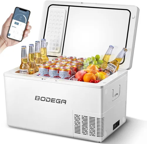 ❄Dual Zone & App Control :BODEGA 12Volt refrigerator is equipped with two zone,the two zones can be independently controlled for temperature.Freezer zone 9.5L + Fridge zone 25.5L = 35L . The 37 quart (35L) large capacity can hold 44 cans of Coke or 22 bottles of water or 15 bottles of red wine. Our car refrigerator also support App control.(For android and ios) (Pls Note that the app only can contrl one of zone's temperature. Touch Screen Panel can contrl two zone's temperature) ❄Car Protection Systerm : BOADEGA car fridge 12v has protect system for different level H/M/L. The system can correspond to different startup voltage and shutdown voltage respectively. Strong compressor can make the empty portable refrigerator temperature's to 32℉(0℃) in 15 min by max mode.Make your camping or journey more enjoyable. ❄Home/Car Dual Use : BODEGA car fridge is equipped with 100~240V AC and 12/24V DC adapters, which can be used at home or in the car. Works as a fridge and freezer to keep food fresh and drinks chilled or frozen such as vegetables, meats, fruits, beverages, etc. Great for picnics, barbecues, camping, and travel. ❄Friendly Design : The built-in LED light design let you easily to get things at night.Our RV refrigerator 12v has portable handles which increase its portability.It's perfect for outdoor activities. ❄2 YEARS WARRANTY&24 HOURS SUPPORT: With 2-Years warranty.We have a professional technical support team responsible for the portable car freezer.If you have any problems,please feel free to contact us via Tienda.We will response you in 24 hours and let you have an wonderful experience.BODEGA car fridge 12v is equipped with 100~240V AC and 12/24V DC adapters, which can be used at home or in the car.