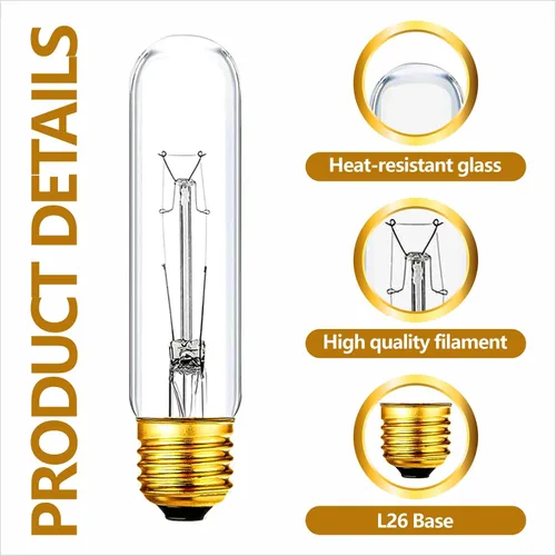 Paquete de 4 / 25 vatios o 40 vatios bombillas de luz de tubo incandescente transparente tubular T10, bombillas de luz de tubo incandescente transparente tubular t10, 280 lúmenes, base mediana; 120 voltios, 2000 horas nominales promedio. Bombilla T10, de tamaño pequeño y aspecto de tubo único, ampliamente utilizada para accesorios de iluminación interior, apliques de pared, lámparas colgantes, lámparas de escritorio, bombilla para acuarios, bombilla para gabinete curio y bombilla para gabinete es ideal para iluminar arte y coleccionables en vitrinas y gabinetes. Bombilla para acuario Foco de exhibición y exhibición: bombillas Edison tubulares T10, tamaño pequeño y aspecto único de tubo que se pueden utilizar ampliamente para accesorios de iluminación de interiores, apliques de pared, iluminación colgante, lámparas de escritorio, ideal para proporcionar una fuente de calor suave para tortugas y reptiles Bombilla T10, Nuestra bombilla de 120 V de 25 W, 120 V, de 5" de largo x 1.25" de ancho, tiene una base de bombilla E26, regulable - Base de latón media (E26). Ahora disponible en LED - Buscar: B0BY2569JS Capacidades de atenuación: Con un rango regulable del 10 al 100%, estas bombillas E26 t10 te permiten establecer el ambiente perfecto, reduciendo la fatiga visual y mejorando la atmósfera de tu hogar. Ofrecemos una garantía de 1 año. Si tienes algún problema de calidad con nuestros productos, no dudes en ponerte en contacto con nosotros, te proporcionaremos un nuevo reemplazo gratis.