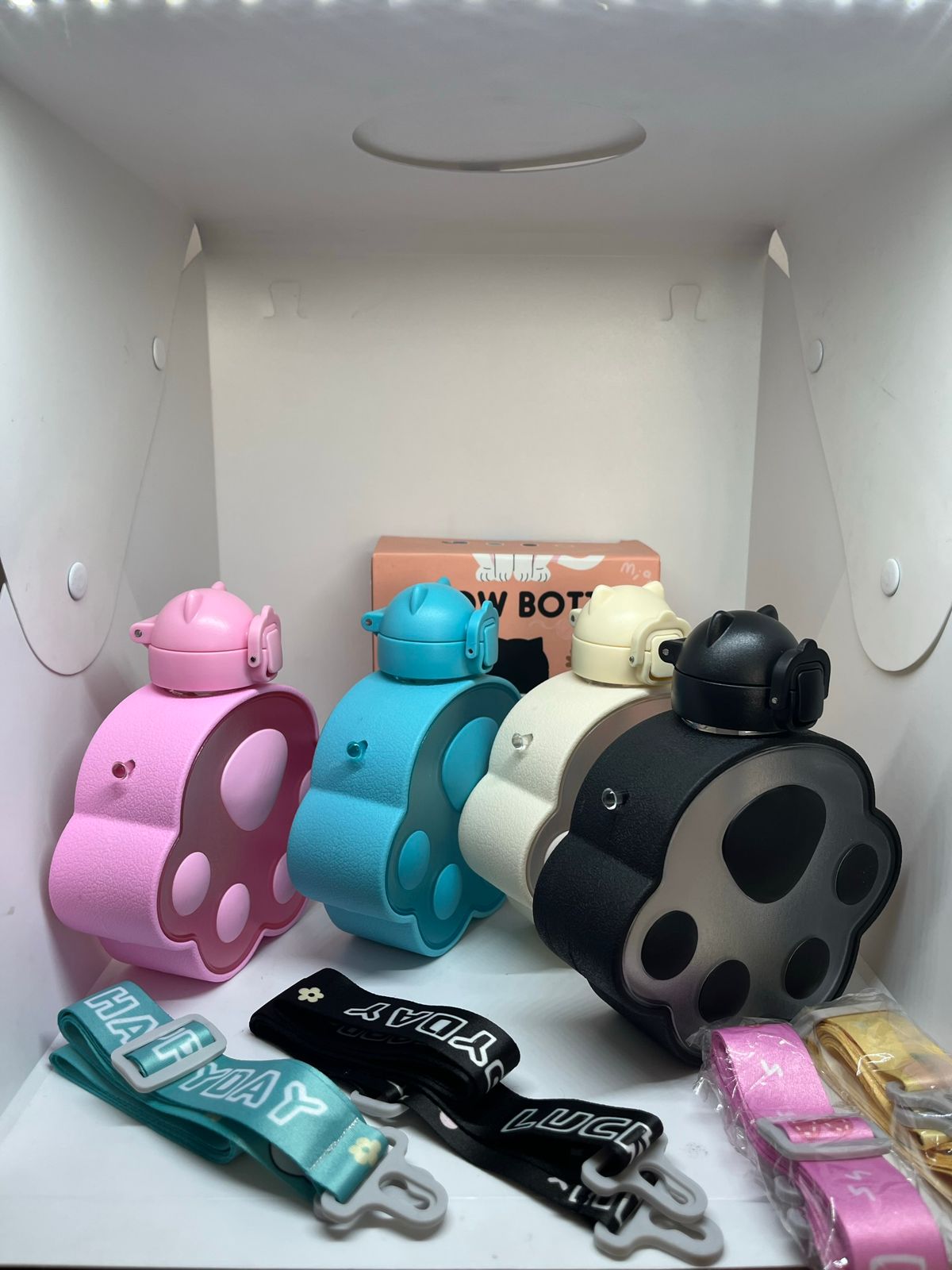 Esta botella de agua en forma de huella está hecha de plástico seguro y libre de BPA, con una capacidad de aproximadamente 400-500 ml. Es ideal para personas de todas las edades debido a su diseño único y llamativo. Además de su funcionalidad como botella, también puede considerarse un accesorio de moda por sus colores vibrantes (rosa, azul, negro y beige) y su correa ajustable que permite llevarla cómodamente al hombro o cruzada.