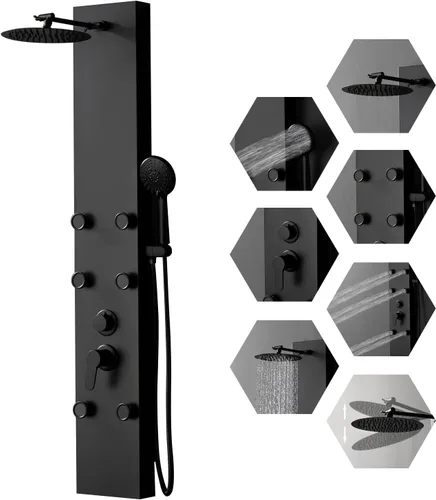 Panel de ducha multifunción: este sistema de panel de ducha 3 en 1 te da la experiencia de ducha más cómoda: ducha de lluvia, spray de masaje corporal y ducha de mano. 6 boquillas corporales calmarán tu músculo y te relajarán Ducha de lluvia: la ducha superior ajustable en ángulo proporciona un spray suave similar a la lluvia para una cobertura total del cuerpo y una sensación refrescante. Boquillas de goma que no se obstruyen para eliminar fácilmente la suciedad con los dedos 6 chorros de masaje y ducha de mano de 3 funciones: los 6 aerosoles corporales ajustables en ángulo maximizarán la fuerza de pulsación para un masaje de ducha increíble y potente. Esta práctica varita de ducha de 3 funciones con manguera larga y flexible llega a lugares de difícil acceso con facilidad Material de alta calidad: el panel de ducha está hecho de acero inoxidable de grado 304 con panel grueso, válvula de mezcla de latón y válvula desviadora de ducha incluidas, mangueras a prueba de explosiones y cubierta superior decorativa que harán de esta ducha una gran actualización para tu baño 【2 centros de control de mango】Control de volumen/temperatura: te permite encender/apagar el agua y ajustar la temperatura del agua con un solo mango; desviador de función: cambiar las funciones entre ducha de lluvia, ducha de masaje corporal y ducha de mano