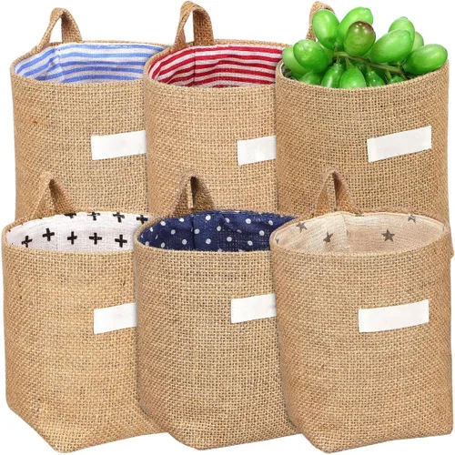 algodón lino - Material: nuestra bolsa de almacenamiento está hecha principalmente de material de lino de algodón que es estable de usar, y seguro al tacto, ligero, no te traerá carga adicional, se ve pequeña y exquisita, pero puede ayudarte a almacenar artículos y ahorrar espacios. - Capacidad adecuada: el tamaño es de 5.1 x 3.9 x 5.5 pulgadas, esta adorable canasta de almacenamiento puede soportar organizar muchos objetos pequeños, como cosméticos, llaves, niños, cuadernos, etc. Mantén tu escritorio en orden y limpio, por lo que puedes rápidamente lo que quieres con esta cesta de almacenamiento. - Efecto decorativo: cada bonita cesta de almacenamiento tiene un cordón para que puedas colocarla en la puerta o la pared, puede ser un soporte para ollas para macetas, lo que significa que puedes colocar las macetas en esta cesta de almacenamiento y hacer que las macetas varíen en variedad, creando un ambiente diferente y cálido en el hogar. - Bonito y pequeño trabajo ampliamente en el dormitorio, baño, cocina, sala de estar, etc. Especialmente se puede utilizar como un soporte para macetas, podría ir a la pared y hacer que tu habitación sea hermosa. - Esta cesta de almacenamiento es adecuada para organizar objetos pequeños como maquinillas de afeitar, maquillaje, cosméticos, herramientas, etc. Ahorra espacio: el almacenamiento es para un fácil almacenamiento.
