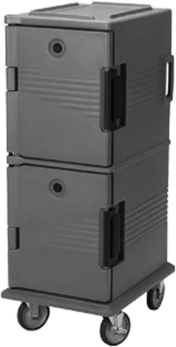 Este carrito de doble compartimento de alta capacidad es resistente y viene con carcasa de polietileno con aislamiento de espuma gruesa. Está diseñado para contener y transportar alimentos calientes o fríos. Es muy fácil de mantener y no se abolla, agrieta, oxida, astilla o rotura. Las juntas herméticas extraíbles mantienen temperaturas seguras de los alimentos durante horas. Los cierres de nailon duraderos se abren fácilmente y se cierran de forma segura. Puertas abatibles abiertas al lateral del carrito para facilitar la carga y descarga. Las asas moldeadas garantizan una fácil maniobra. Los parachoques moldeados minimizan los daños a paredes, muebles y otros equipos. El carrito puede contener 12 sartenes de 2-1/2 pulgadas de profundidad, 8 4 pulgadas de profundidad, 6 6 pulgadas de profundidad y 4 bandejas de 8 pulgadas de profundidad de tamaño completo. Las dimensiones internas del gabinete son de 21 pulgadas de profundidad por 13-1/8 pulgadas de ancho por 19-1/8 pulgadas de alto. Incluye ruedas de 6 pulgadas, 2 traseras fijas y 2 giratorias delanteras, una con freno. Disponible en color negro. Mide 27-1/8 pulgadas de profundidad por 20-1/2 pulgadas de ancho por 54 pulgadas de alto.