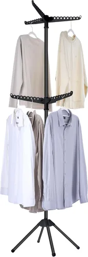 [Gran capacidad] Este escurridor de 2 niveles puede contener 54 piezas de ropa u otros accesorios, tres varillas colgantes están diseñadas con agujeros para fijar las perchas para mantener la ropa seca ordenadamente. Plegable y ahorra espacio: este escurridor vertical mide 25.6 pulgadas de profundidad x 25.6 pulgadas de ancho x 74.8 pulgadas de alto y ocupa muy poco espacio. Después de su uso, simplemente dobla las cuatro patas y las tres barras de secado en un tamaño más pequeño: 2.2 pulgadas de profundidad x 2.2 pulgadas de ancho x 88.6 de alto, que se puede apoyar contra el reposapiés, perfecto para cuartos de lavado de apartamentos o espacios estrechos y esquinas. Estante giratorio de 360º: equipado con un diseño giratorio de 360 grados, este estante de secado de ropa te proporciona la comodidad de colgar y acceder a tu ropa. Fácil de montar y transportar: este estante de secado se puede instalar en solo cuatro pasos y se puede completar en tres minutos. El diseño fácil de desmontar y montar hace que sea posible llevarlo contigo cuando necesites secar tu ropa en un viaje de campamento. Fuerte y duradero: este escurridor de ropa está hecho de tubo grueso de acero inoxidable, resistente al óxido y resistente, el diseño de cuatro patas de apoyo proporciona la mejor estabilidad, capacidad de peso total de 66 libras