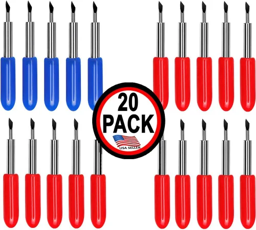 Apoya a nuestra pequeña empresa estadounidense: productos de hoja de calidad fabricados y vendidos con orgullo en Estados Unidos Funciona con todas las marcas de máquinas de corte Tapa roja y azul ángulo de 45 y 60 grados para usar con papel y medios similares Las cuchillas de carburo cementado duran 3 veces más y se mantienen afiladas Paquete de 20 cuchillas empaquetadas a granel, incluye 15 cuchillas estándar y 5 de corte profundo
