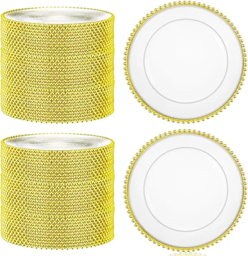 Cantidad suficiente: recibirás 100 piezas de placas de servicio de carga transparentes, diseñadas en forma redonda, exquisita y simple, con mano de obra fina; el paquete viene con un amplio número de placas de carga de cuentas doradas a granel que sin duda pueden satisfacer tus requisitos diarios de decoración y uso y necesidades de reemplazo de fiestas Elegante diseño de cuentas: nuestros cargadores de cena de plástico redondo transparente cuentan con una forma redonda simple con un elegante diseño de borde de cuentas en el borde que añade un aspecto moderno, captarán la atención al instante y mejorarán la presentación de alimentos en tus eventos con catering; estos platos de carga de plástico dorado transparente son la opción ideal para varias fiestas, eventos, festivales Material de calidad: cada plato de carga de cena con cuentas doradas está hecho de plástico de calidad, que es resistente y confiable, no es fácil de romper ni astillar, y se puede aplicar durante mucho tiempo; estos platos de carga de borde con cuentas son ligeros y apilables para un fácil almacenamiento y portabilidad, y se pueden limpiar para el próximo uso Resistente a derrames y protección de mesa: estos platos de carga transparentes para fiesta cuentan con 8.66 pulgadas de diámetro interno y 13 pulgadas de diámetro externo, diseño de cuentas que acentúa los lados, con el tamaño adecuado para que lo pongas debajo de un plato de ensalada, tazón de sopa, plato de cena y otros tipos de suministros de cena para evitar derrames ensucien o dañen la parte superior de la mesa Multiusos: nuestros platos de carga redondos de cuentas tienen una forma elegante con un diseño de borde de cuentas que funciona bien para cualquier ocasión, como bodas, baby showers, fiestas de cumpleaños, fiestas de graduación, celebraciones de vacaciones, eventos junto a la playa, recepciones al aire libre y más; crean un efecto glamoroso que mejorará la elegancia de tu mesa