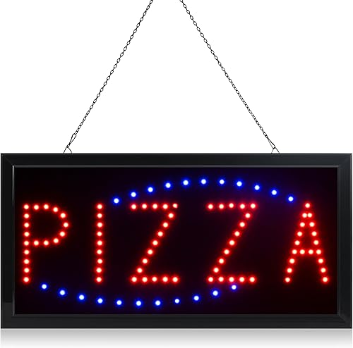 Letrero animado de neón de pizza: cuenta con colores brillantes con animación intermitente para captar la atención del cliente. Perfecto para negocios de alimentación: ideal para pizzerías, restaurantes, cafeterías, camiones de comida y bares. Tamaño grande de 19 x 10 pulgadas: visible desde la distancia, ayudando a aumentar el tráfico sin cita previa. Fácil de colgar: incluye cadena para una instalación rápida en las ventanas de la tienda. LED de bajo consumo – Iluminación duradera estilo neón con bajo consumo de energía para un rendimiento duradero.