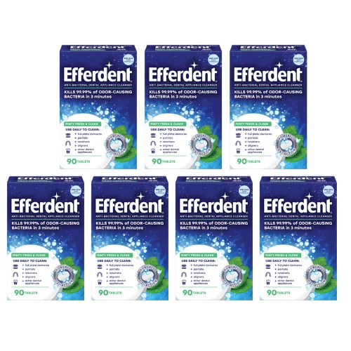 Utiliza las tabletas limpiadoras de retenedores efferdent a diario para limpiar retenedores, dentaduras postizas de placa completa, parciales, alineadores y otros aparatos dentales Mata el 99.99% de las bacterias que causan olores en 3 minutos mientras que es suave y no abrasiva Efferdent Las tabletas limpiadoras antibacterianas Minty Fresh & Clean limpian los aparatos dentales mientras les dan un sabor fresco a menta Efferdent Las tabletas de limpieza de dentaduras postizas y retenedores Fresh & Clean Minty Fresh utilizan una potente acción oxi-para eliminar las manchas difíciles en lugares difíciles de alcanzar Efferdent Las tabletas limpiadoras de retención combaten la acumulación de placa y matan las bacterias que causan olores dejando los aparatos dentales frescos y listos para usar
