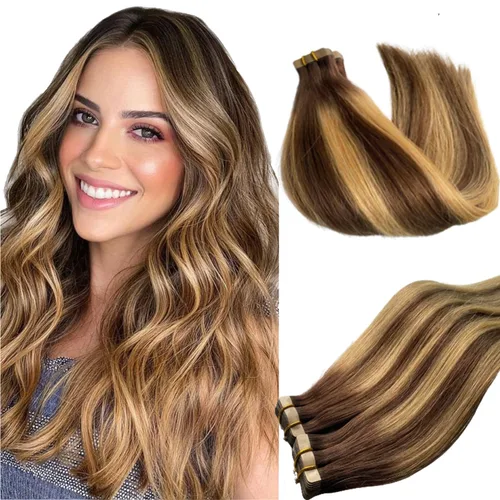 Extensiones de cabello humano con cinta adhesiva, color degradado, marrón chocolate a rubio caramelo, extensiones de cabello humano real, 12