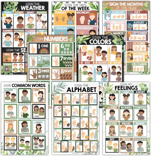 Hadley Designs Carteles de lenguaje de señas para decoración de aula, 8 carteles ASL para el aula, tabla de lenguaje de señas estadounidense para