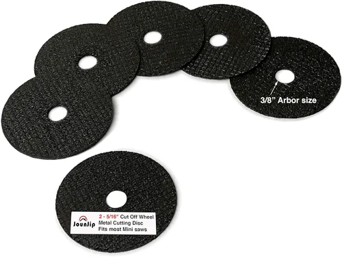 JOUNJIP Rueda de corte de metal de 2 5/16 pulgadas, paquete de 6 cuchillas de repuesto para mini sierra de inglete, discos de corte de alta calidad, resistentes y duraderos, ideales para cortar y moler todo tipo de metal. 2 5/16 pulgadas de diámetro, un grosor KERF de 1/16 pulgadas, eje de 3/8 pulgadas y una velocidad máxima de 30,000 RPM. También se puede utilizar como accesorio de herramienta giratoria con la arandela y el mandril de tamaño correcto (no incluidos en el juego de 6 piezas). Especificaciones de la rueda: 2 5/16" x 1/16" x 3/8" para usar con mini sierra de corte de inglete JOUNJIP y la mayoría de mini sierras de eje de 3/8"