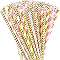 DuraHome - Paquete de 200 pajitas de papel biodegradables con diseño de rayas doradas y rosas de 8.25 pulgadas para uso diario, fiesta de