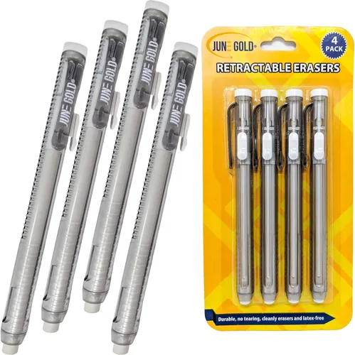 INCLUYE: 4 bolígrafos de borrador de vinilo blanco retráctiles y recargables Fuerza: Estos borradores son firmes y más abrasivos, lo que los hace mejores para eliminar marcas más oscuras, algunas tintas y algunos lápices de colores. CALIDAD: Borrado de precisión diseñado para limpiar su papel sin rasgarse y sin dejar manchas. DISEÑO: Cada borrador es libre de látex, libre de BPA y no tóxico. Perfecto para hogares y oficinas. Tamaño: cada bolígrafo mide 5.25 pulgadas de largo y cada borrador mide 3.74 x 0.26 pulgadas o 3.7 x 0.3 in.