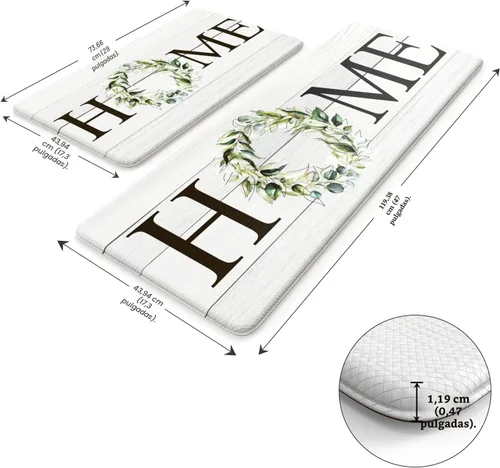 Alfombrillas de cocina cómodas y antifatiga: las alfombrillas de cocina antifatiga extra gruesas de 0.47 pulgadas de estilo rústico para el fregadero del hogar seguramente proporcionan amortiguación en tus pies, rodillas, espalda baja y articulaciones para estar de pie. Siéntete cómodo como caminar sobre una nube firme pero suave cuando estás cocinando en la cocina o trabajando en tu escritorio de pie Juego de Tapetes de Cocina de 2 Piezas: El juego contiene 2 tapetes de cocina rectangulares que miden 17.3" x 47" + 17.3" x 29". Los tapetes antifatiga están hechos de materiales de PVC de alta calidad y premium, para garantizar que los tapetes mantengan su forma, incluso con uso intensivo prolongado y a largo plazo Antideslizante y seguro: el tapete de cocina antideslizante está diseñado con respaldo antideslizante que ayuda a mantener la alfombra resistente y evitar que se mueva o resbale, proporciona seguridad para tu familia. El tapete de cocina se puede utilizar en múltiples superficies (azulejos, madera, cerámica, mármol, etc.). Nota: el tapete debe colocarse en una superficie seca durante el uso Fácil de limpiar y resistente al agua: Las suaves alfombrillas de cocina son resistentes a las manchas, impermeables y fáciles de limpiar. Simplemente limpia la alfombrilla con un paño húmedo o esponja o utiliza una aspiradora de mano según sea necesario, ahorra tu tiempo y energía Versátil: KIMODE proporciona juegos de alfombras de cocina con diseño de letras para el hogar para que coincida con la decoración de tu hogar. La espuma suave y gruesa proporciona un amplio apoyo para estar de pie en el fregadero de la cocina, lavandería, oficina, baño, comedor o cualquier otra zona de alto tráfico