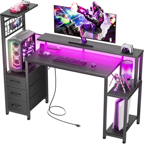 【Textura de fibra de carbono】: Este escritorio para juegos está diseñado para el rendimiento. El escritorio combina una textura agresiva de fibra de carbono con un núcleo resistente de MDF, estableciendo una estética elegante y de alto rendimiento para tu configuración. Su superficie lisa y resistente a los arañazos puede soportar intensas sesiones de juego mientras se siente premium al tacto. El acabado fácil de limpiar garantiza que tu campo de batalla se mantenga impecable con un mantenimiento mínimo, para que puedas mantenerte completamente inmerso en tu juego. 【Iluminación LED colorida 】Transforma tu espacio en un centro de mando personal con iluminación RGB avanzada. Con 10 colores estáticos, 10 modos dinámicos y 6 niveles de brillo, te da la libertad de crear el ambiente perfecto. Utiliza la aplicación intuitiva para personalizar y guardar tus efectos favoritos con un solo toque. Deja que las luces te sumerjan en el juego, bloqueen las distracciones y proporcionen una inmersión total. Estación de carga integrada: nunca dejes que una batería descargada te deje fuera del juego. Este escritorio está equipado con 3 tomas de corriente alterna y 2 puertos de carga USB de alta velocidad. Mantén tu teléfono, auriculares y equipo esencial de juego encendidos simultáneamente, todo sin pausar tu sesión. Mantente en la zona y juega sin interrupciones. 【Espacio de Almacenamiento Amplio】Maximiza tu espacio y minimiza las distracciones con nuestro sistema de organización cuidadosamente diseñado. Cuenta con 3 cajones de tela, 4 ganchos laterales y un estante de almacenamiento reversible que tiene el tamaño perfecto para tu torre de PC para juegos. Mantén todos tus artículos esenciales perfectamente almacenados y al alcance de tu mano, para que puedas mantener un escritorio limpio y una mente libre de desorden, completamente enfocada en lo que realmente importa. 【Estabilidad y diseño reversible】Este escritorio para juegos combina una estabilidad resistente con un diseño flexible. Con una capacidad de carga de 100 kg y patas antideslizantes ajustables, se mantiene firme en cualquier suelo. Su diseño reversible se adapta a cualquier habitación, y dos escritorios pueden conectarse para crear una inmersiva estación doble. Es la elección perfecta para jugadores serios y un gran regalo para amigos. 【Fácil de montar y confiable】Nuestro escritorio está diseñado para un fácil montaje. Viene con un conjunto completo de herramientas e instrucciones detalladas. Todas las piezas están claramente etiquetadas. Lo que debe hacer es seguir las instrucciones paso a paso. Si encuentras algún problema relacionado con el producto, no dudes en ponerte en contacto con nosotros. Nuestro equipo profesional de atención al cliente está listo para ayudarlo en 24 horas.