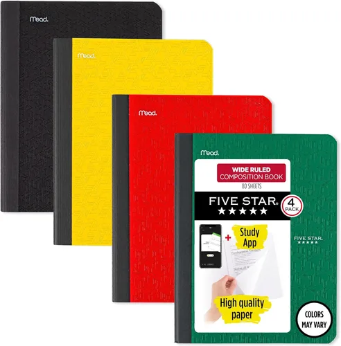 Pregunta sugerida sobre Libro de composición Five Star + aplicación de estudio, paquete de 4, papel rayado ancho, 7-1/2" x 9-3/4", 80 hojas, verde bosque, azul marea, rojo ¿Este producto sí me sirve para lo que necesito?