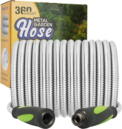 Construcción de acero inoxidable 304 mejorada, ultra durabilidad: la manguera de metal 360Gadget Pro está diseñada con una construcción mejorada de acero inoxidable interconexiones para proporcionar resistencia adicional a la manguera, lo que reduce la posibilidad de separación de metal. La manguera puede soportar fácilmente condiciones duras y arrastrarse sobre superficies duras. No tienes que preocuparte por reemplazar la manguera cada año o dos. Ahorre su dinero. Tubo interior flexible rodeado de capa protectora de metal, combinación perfecta de peso ligero y durabilidad: la manguera de metal de acero inoxidable de 50 pies tiene una estructura de manguera de doble capa y pesa 6.82 libras, lo que resulta en un diseño ligero pero duradero. En comparación con una manguera de goma del mismo tamaño, nuestra manguera es 2.86 libras más ligera, por lo que es la elección perfecta para personas mayores y personas con problemas de movilidad. Di adiós a las mangueras de agua pesada que tensan tu espalda y brazos, y hola a la jardinería definitiva. Tecnología de interconexión de manguera de acero inoxidable, no se dobla, pero se enrolla fácilmente: la manguera de jardín resistente 360Gadget está diseñada con tecnología de interconexión en espiral que evita que se doblen y se doblen, asegurando un flujo constante de agua que le ahorra tiempo y energía. A diferencia de las mangueras tradicionales, nuestra manguera de agua de metal es fácil de enrollar en un círculo perfecto para un almacenamiento cómodo. No más luchas para enrollar una manguera retorcida o desenredarla cada vez que necesites usarla. La manguera gira libremente dentro del mango, libera tensión y fácil de conectar: el mango suave giratorio de 360 ° permite que la manguera gire libremente en el interior, liberando tensión y evitando torceduras mientras te mueves por tu jardín. Con nuestro mango giratorio fácil de usar, puedes quitar la boquilla sin esfuerzo y agarrarla a todo el mango para fijarla a la espita, sin tener que pellizcar los dedos alrededor del accesorio. Nuestro mango garantiza una experiencia de riego suave y sin costuras, por lo que es fácil y divertido de usar. Diámetro interior del tubo de 3/8", más que lo suficientemente capaz para la tarea de riego general: Nuestra manguera de metal está diseñada con un diámetro de tubo interior de 3/8", que ofrece el equilibrio perfecto entre practicidad y flexibilidad. Es suficiente para la mayoría del trabajo diario de jardín. Para una manguera de agua de 3/8 pulgadas de diámetro interior de 25 pies, puedes esperar aproximadamente 4.84 galones de descarga de agua cada minuto con una entrada de 60 PSI, y 100 pies es de casi 2.94 galones. Nuestra manguera flexible es perfecta para aquellos que quieren una gran portabilidad en su patio trasero y jardín. Obtenga su manguera de jardín conectable ahora: nuestra manguera de metal está disponible en longitudes de 25 pies, 50 pies, 75 pies y 100 pies y se puede conectar fácilmente para extender la longitud a 125 pies, 150 pies o 200 pies. Con la manguera de agua conectable 360Gadget, puedes personalizar fácilmente la longitud de tu manguera para adaptarse a tus necesidades específicas, dándote un control completo sobre tus tareas de riego.