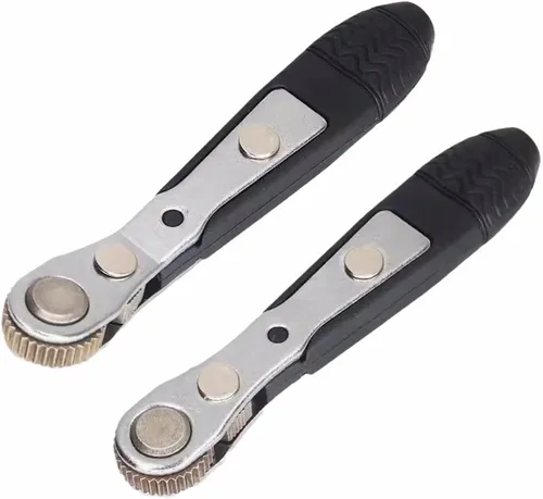 Mini llave de trinquete, 2 piezas de 1/4 de pulgada de 90 grados en ángulo recto con cuarto de bolsillo con perfil bajo, herramienta micro EDC con mango de accionamiento reversible para puntas (puntas no incluidas) El juego de mini llaves de trinquete incluye una mini llave de trinquete recta y una mini llave de trinquete desplazada El destornillador de ángulo recto de 4.33 pulgadas de largo y 1/2 pulgada de grosor es lo suficientemente pequeño para funcionar en lugares reducidos, espacios reducidos, lo que puede ayudarte a trabajar de manera más ordenada, rápida y eficiente El destornillador de 90 grados está alimentado con un sistema de trinquete reversible de 36 dientes para garantizar un trinquete suave en ambas direcciones; y el destornillador de puntas cerradas de tamaño de bolsillo en miniatura tiene ayuda magnética para mantener la broca insertada apretada en su posición La mini llave de trinquete es ideal tanto para profesionales como para principiantes que siempre están buscando la herramienta adecuada para el trabajo