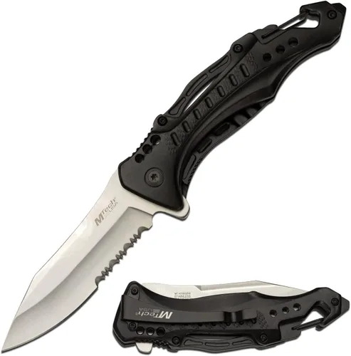 Pregunta sugerida sobre MTech USA Cuchillo plegable - Hoja de acero inoxidable con acabado satinado parcialmente dentado, mango de aluminio negro, mosquetón, abrebotellas ¿Este producto sí me sirve para lo que necesito?