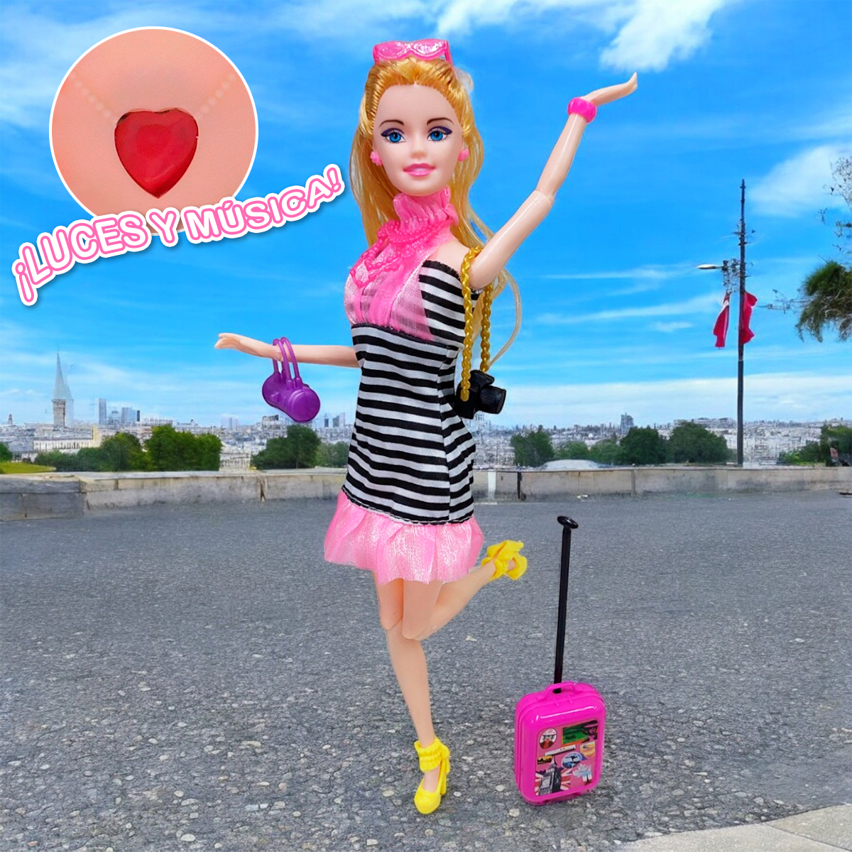 ¡Esta muñeca viajera está lista para la aventura con estilo!