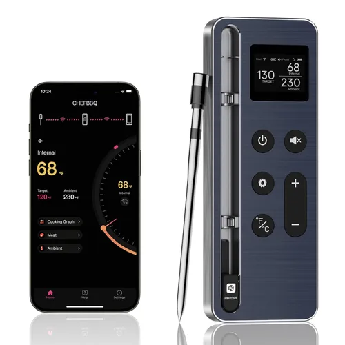 Un ayudante de cocina confiable: nuestro termómetro de alimentos monitorea tu asado en tiempo real y proporciona datos confiables. La sonda ultrafina de 0.197 in garantiza una precisión de temperatura dentro de 1.8°F. Es un gran ayudante para cocinar comidas navideñas como pavo de Navidad Rango inalámbrico de 800 pies: el termómetro inalámbrico Paneceia para carne puede controlar tu comida hasta 800 pies con Bluetooth 5.2. La conectividad remota de largo alcance significa que puedes controlar la cocción mientras chateas con amigos y familiares y aún así obtener una comida perfectamente cocinada Seguro y resistente al calor: la sonda está hecha de acero inoxidable de grado alimenticio con mango de cerámica de circonita y cuenta con sensores de temperatura duales, lo que te permite controlar la temperatura interna de la carne (hasta 212 °F) y la temperatura ambiente (hasta 572 °F) simultáneamente 【Monitoreo inteligente de aplicación】La aplicación CHEFBBQ de nuestro termómetro digital para carne te permite preajustar las temperaturas y la cocción para varias carnes y también ofrece ajustes de alerta y notificación. Será un buen regalo para Navidad Batería de larga duración: una carga corta de 5 minutos de la sonda es suficiente para durar 10 horas y una sonda completamente cargada puede durar más de 30 horas. Solo tarda 15 minutos para que la sonda esté completamente cargada y 2 horas para el anfitrión