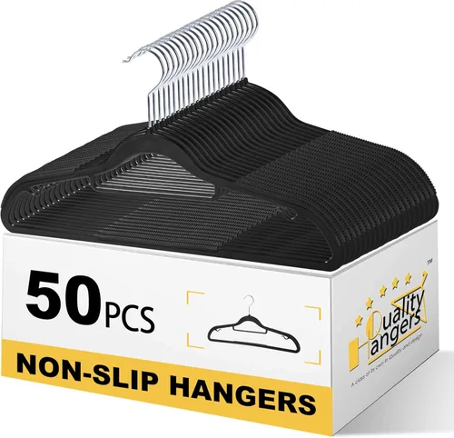 Mantén tu armario perfectamente organizado con un juego de 50 ganchos de plástico de alta calidad que organizarán todos tus artículos de ropa, pantalones, vestidos, faldas, camisas, abrigos y blusas y los mantendrán libres de arrugas. Los agarres de goma te ahorrarán tiempo y esfuerzo: no más perchas de terciopelo que hacen que la ropa se pegue y te causen frustración. Nuestros ganchos de tela cuentan con agarres de goma en ambos lados y la parte inferior que evitan que tu ropa se resbale. Llega a tu ropa más fácil: con ganchos giratorios de 365 grados, nuestros ganchos ergonómicos te ayudan a encontrar la ropa que necesitas más fácilmente. Y su diseño delgado y compacto maximiza el espacio en pequeños armarios de dormitorio o guardería. Añade clase a tu armario: nuestras perchas de tela de 16.54 pulgadas de largo x 8.66 pulgadas de alto están disponibles en negro, blanco y gris atemporales. Elige tu juego en el color de tu preferencia y combínalo con tus perchas de terciopelo o madera Perchas resistentes y hechas para durar: el material plástico duradero y los ganchos de metal resistentes hacen que nuestras perchas sean únicamente duraderas. Cuelga artículos de ropa de hombres, mujeres y niños de hasta 11 libras de peso, organiza todos tus armarios