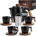 MIAMIO – 34 Oz Ceramic Tea Pot Set with Infuser and Cups/Tea Strainer, 4 Ceramic Tea Mugs (10 Oz), Bamboo Saucers/Handle for Home and Office (Black)