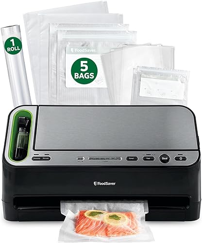 Ahorra dinero y sella la frescura: la carne conservada con el sistema FoodSaver en el congelador puede durar hasta 3 años y aún así sabe fresca, sabrosa y libre de quemaduras por congelación; las comidas preparadas con anticipación, las sobras y los productos almacenados en el refrigerador se mantendrán frescos hasta semanas después en lugar de echarse a perder en días. Incluye: (1) rollo de sellado al vacío de 11"x10' (3) bolsas de sellado al vacío de 1 cuarto (2) bolsas de sellado al vacío de 1 galón (3) bolsas con cremallera de 1 cuarto (2) bolsas con cremallera de 1 galón DETECCIÓN AUTOMÁTICA DE BOLSAS: LA DETECCIÓN AUTOMÁTICA DE BOLSAS HACE EL SELLADO AL VACÍO MÁS FÁCIL QUE NUNCA: SIMPLEMENTE COLOQUE LA BOLSA EN LA CÁMARA DE VACÍO Y LA MÁQUINA HACE EL RESTO PARA Asegurar que tu comida se mantenga fresca y sabrosa Fácil de usar: el almacenamiento y el cortador de rollos integrados le permiten hacer bolsas de tamaño personalizado para adaptarse a lo que selle, mientras que los indicadores de luz LED lo guían fácilmente a través del proceso de sellado al vacío Sellado muy consistente: garantizado para alcanzar un nivel óptimo de vacío y sellado hermético; el V4440 es duradero, de alta calidad y respaldado por una garantía limitada de 5 años Detección automática de humedad: la tecnología inteligente detecta automáticamente la humedad y cambia al modo correcto para garantizar que se logre un sellado hermético. La bandeja de goteo extraíble patentada atrapará cualquier líquido de sobreflujo y es segura para lavavajillas, lo que hace que este aparato de cocina sea fácil de limpiar y mantener PRODUCTO PROBADO Y CERTIFICADO POR NRTL: TODOS LOS ELECTRODOMÉSTICOS FOODSAVER ESTÁN CERTIFICADOS ETL O UL POR LABORATORIOS DE PRUEBA RECONOCIDOS A NIVEL NACIONAL (NRTLS) PARA EL CUMPLIMIENTO CON LOS ESTÁNDARES APLICABLES DE PRUEBA DE SEGURIDAD DEL PRODUCTO; LA SEGURIDAD ES NUESTRA PRIORIDAD NÚMERO 1 Compatibilidad: funciona con rollos de sellado al vacío de 8 pulgadas y 11 pulgadas, todos los tamaños de bolsa prefabricados, bolsas con cierre de frescos, recipientes frescos y marinador rápido; los accesorios opcionales incluyen selladores de tarros de masón regulares y de boca ancha y botella de ahorro de alimentos. LE STOPPERS PARA BOTELLAS DE VINO Y ACEITE
