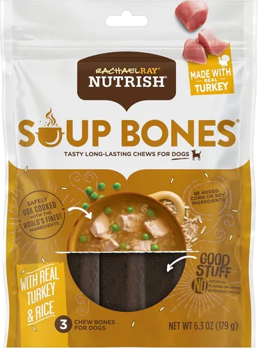 Masticables para perros de larga duración: contiene ocho (8) bolsas de 6.3 onzas de 24 masticables para perros en total Huesos masticables para perros adultos: masticables sabrosos y duraderos para tu perro Golosinas para perros de pavo: hechas con pavo real y arroz USA COOKED: Cocinado de forma segura en Estados Unidos con los mejores ingredientes del mundo SIN SABORES ARTIFICIALES: Sin ingredientes añadidos de maíz o soja, y sin sabores artificiales ni comidas de subproductos animales
