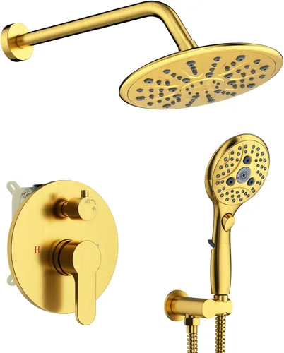 Suncleanse Juego de grifos de ducha dorados, cabezal de ducha de lluvia de 8.5 pulgadas con sistema completo de ducha de mano de 7 ajustes,