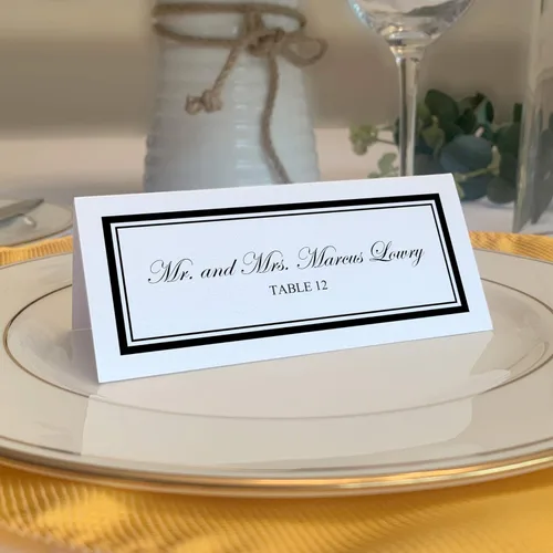 Cuenta con un borde de doble línea que enmarca cada tarjeta de lugar Impreso en cartulina blanca pesada de 80 lb Tamaño: 4.25 pulgadas de ancho x 3.66 pulgadas de alto - Tamaño final después de plegado: 4.25 pulgadas x 1.83 pulgadas Perforadas y anotadas. Plantilla de Microsoft Word descargable incluida. Incluye (10) hojas de 8.5 x 11 pulgadas. (60) Tarjetas de lugar individuales. Negro