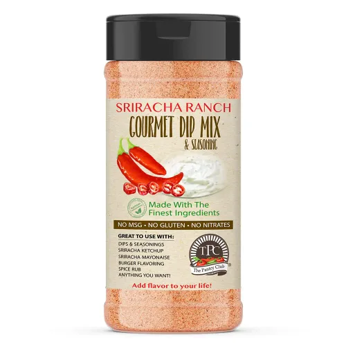 El rico condimento mixto viene en un recipiente de tamaño a granel que puedes usar para agregar a tus recetas favoritas Sriracha Ranch Dip Mix es libre de gluten, sin nitratos y sin MSG añadido Prepara una mezcla clásica con crema agria, hummus, yogur griego, queso crema o yogur natural Como condimento para: Cerdo, Spice Rub, Hamburguesas, Carne de res, Pollo Como salsa para beber: salsa de tomate Sriracha, mayonesa Sriracha, papas fritas/pretzels, verduras