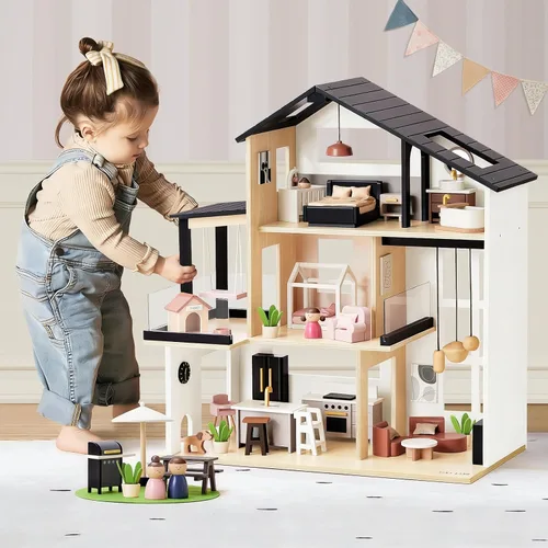 Experiencia de juego inmersiva: la casa de muñecas Tiny Land Modern Family va más allá de los juguetes típicos, proporcionando un viaje inmersivo para los niños. Múltiples habitaciones interactivas y 53 accesorios de mobiliario meticulosamente diseñados animan a los niños a crear historias sin fin, fomentando la creatividad, la empatía y el disfrute práctico. Cada pieza está fabricada con cuidado, asegurando durabilidad y seguridad. Descubre la vida moderna: Observa cómo tus hijos se transforman en decoradores de interiores, narradores de historias y visionarios creativos mientras exploran la vida contemporánea. Desde organizar cenas imaginarias en la cocina de última generación hasta arreglar los muebles en la acogedora sala de estar, las posibilidades dentro de esta casa de muñecas de madera son ilimitadas. Diseño inclusivo y versátil: esta casa de muñecas de madera cuenta con 7 habitaciones, incluyendo una sala de estar, patio trasero, dormitorio, baño, balcón, habitación de los niños y habitación de los padres, con muebles modernos correspondientes. Con un total de 53 muebles, los niños pueden organizar y diseñar habitaciones a su gusto. Diseñado para niños de todas las edades, fomenta el juego cooperativo, por lo que es una experiencia familiar saludable para hermanos, amigos y padres. Construidas para durar y espaciosas: hechas de madera sostenible de alta calidad, nuestras casas de muñecas representan durabilidad y resistencia. Midiendo 27H x 24L x 12W, proporciona un amplio espacio para que múltiples niños jueguen sin sentirse abarrotados. Calidad y atención al cliente: En Tiny Land, nos dedicamos a ofrecer servicios y productos de primera categoría. Si tienes alguna pregunta sobre el producto, no dudes en ponerte en contacto con nosotros rápidamente.