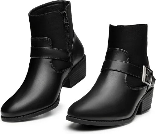 Trary Botines para mujer, punta redonda, tacón bajo, botines con cremallera lateral, botines de invierno con hebilla, con forro polar