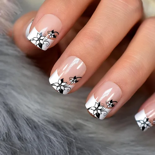 Ver Uñas a Presión Ir al inicio mIAUñas postizas a presión, uñas postizas blancas naturales con diseño de flores negras francesas, pegamento de gel UV y uñas postizas reutilizables con large