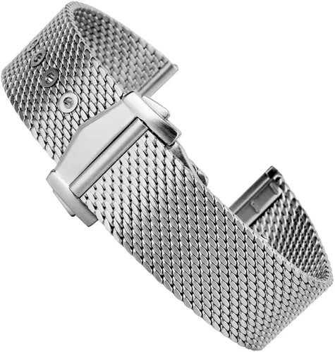 Comodidad superior: fabricada con precisión, la correa de malla tejida proporciona un ajuste cómodo y transpirable, que se adapta a la muñeca para uso durante todo el día sin molestias Cierre plegable: el cierre plegable de la correa del reloj se abriría al presionar los dos botones, te permite liberar y cerrar fácilmente tu reloj Ajuste ajustable: los siete agujeros ajustables permiten un fácil tamaño, lo que hace que la correa de reloj sea adecuada para muñecas de 6.5 a 8.6 pulgadas y proporciona un ajuste perfecto para cada usuario Estilo versátil: el diseño versátil de la banda de malla plateada hace que sea fácil de combinar con atuendos casuales y formales, lo que te permite pasar sin esfuerzo del trabajo al ocio Durabilidad y resistencia: hecha de acero inoxidable de primera calidad, la banda de malla está diseñada para soportar el desgaste diario mientras conserva su aspecto elegante y pulido