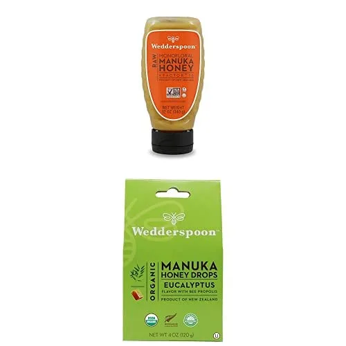 Incluye: una botella exprimible de 12 onzas de miel de manuka KFactor 16 y una caja de gotas de miel de manuka en eucalipto y propóleos de abeja MIEL MONOFLORAL: Nuestra miel de Manuka es cruda, nunca pasteurizada, verificada por el Proyecto sin OMG Miel de Manuka, rastreable de colmena a casa. Disfruta de una botella de polietileno sin BPA y sin lixiviación llena de deliciosa miel KFactor 16 USO DE MIEL DE MANUKA: Uno de los verdaderos superalimentos de la naturaleza con múltiples usos; remedios caseros que estimulan el sistema inmunológico y cuidado de la piel de bricolaje; para un levantamiento de energía adicional, simplemente agregue como una adición dulce a su receta favorita de batidos GOTAS DE MIEL DE MANUKA: Calma las gargantas con esta receta probada en el tiempo que aún se elabora con cuidado en pequeños lotes. Perfecto para la temporada de resfriados y alergias comunes. Nuestras gotas están hechas sin gluten, lácteos o nueces. Cada caja contiene aproximadamente 20 gotas EUCALIPTO Y PROPÓLIOS DE ABEJAS: Las gotas de miel de manuka orgánica de Wedderspoon El sabor de eucalipto está elaborado con miel de Manuka orgánica genuina de Nueva Zelanda y propóleos de abeja, que se utiliza con mayor frecuencia para ayudar a estimular el sistema inmunológico